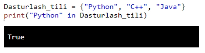 Yuqoridagi to'plam ma’lumotlar to’plami ichida “Python” elementi mavjud ekan, chunki dasturimiz True javobini chiqardi. Agar to’plam ichida biz izlagan element bo’lmasa dastur False javobini chiqaradi.