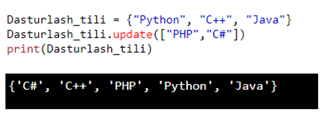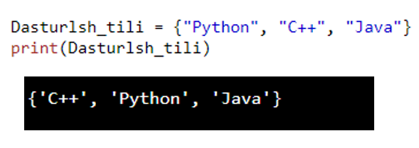 Keling endi shu to’plam ichidan “Python” elementini chiqarish dasturini yozib ko’ramiz.