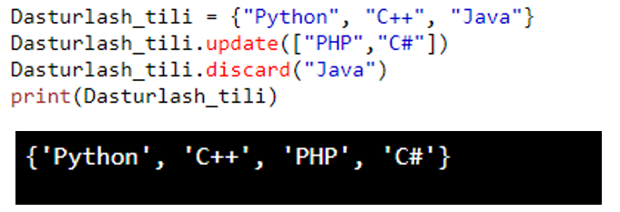 Demak update funksiyasi orqali to'plamga yangi bir to'plamni yoki elementlarni qo’shishimiz mumkin ekan. Keling endi discard usulidan foydalanib ko’ramiz, yuqorida aytib o’tilganidek bu metod orqali belgilangan elementni to'plamdan olib tashlash mumkin, yuqoridagi to'plamdan “Java” elementini olib tashlash dasturini yozamiz.