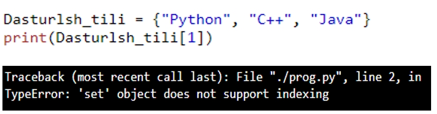 Ko’rib turganingizdek to'plam o’zgaruvchisi bu obyektni qo’llab quvvatlay olmasligini aytmoqda chunki bu to’plamda index raqami mavjud emas. Lekin to’plam ichida bizga kerakli element bor yoki yo’qligini bilishimiz mumkin.
