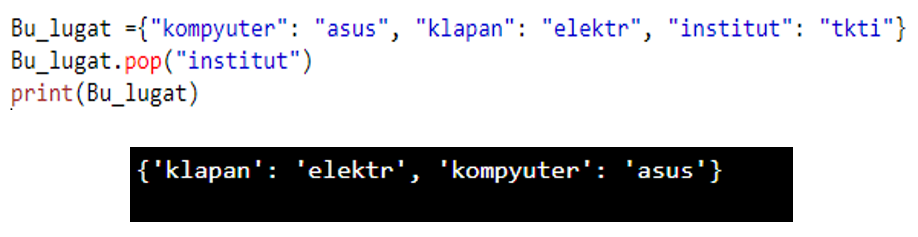 Keling endi siz bilan bu metodlardan foydalangan holda o’z dasturimizni yozib ko’ramiz. Masalan pop funksiyasidan foydalanib lug’atdagi istalgan kalit va qiymatni olib tashlashimiz mumkin.