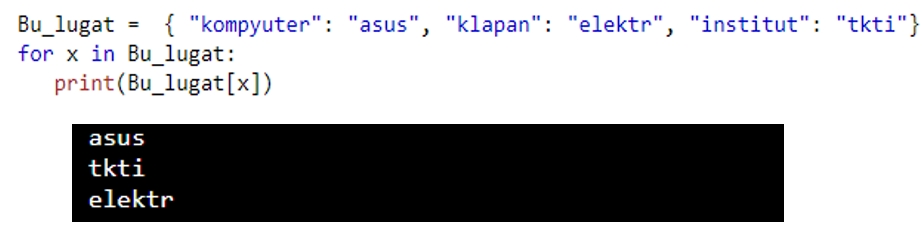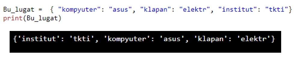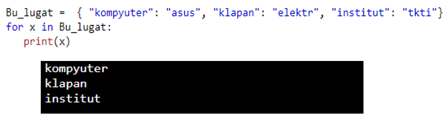 Lug’atdagi keyingi dasturimiz kalit so’zlar va qiymatlarni alohida chiqarish haqida bo’ladi. Bunda biz for va in operatorlaridan foydalanamiz. Dastur quyidagicha yoziladi.