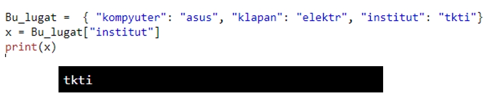 Dasturdagi kompyuter, klapan, institute so’zlari kalit so’zlar hisoblanadi, asus, elektr, tkti lar esa qiymatlardir. Masalan bizga tkti qiymati kerak bo’lsa biz institute kalit so’ziga murojaat qilamiz.