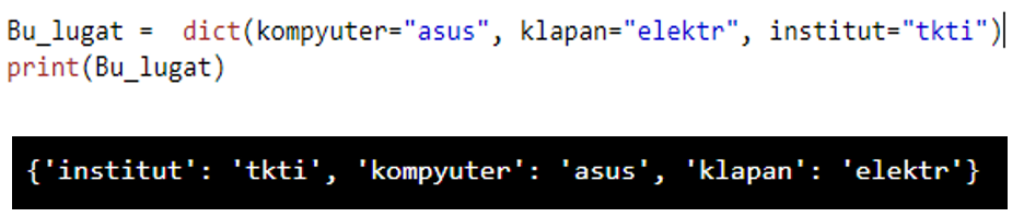 Lug’at to’plamida dict() konsruktoridan foydalanib xam kalit yuqoridagi to’plamni chiqarishimiz mumkin.