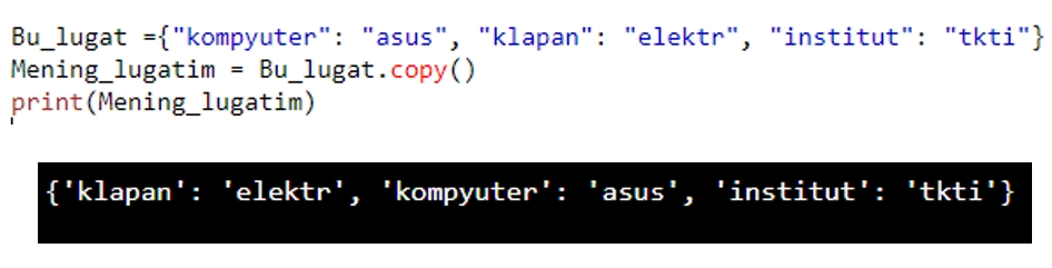Bundan tashqari, Pythonda, lug’at to’plamida xam foydalanishimiz mumkin bo’lgan bir nechta ichki metodlar mavjud. Ular quyidagilardan iborat.