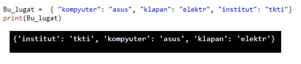 Endi dasturni quyidagicha biroz o’zgartirib lug’atdagi barcha qiymatlarni chiqarishimiz mumkin.