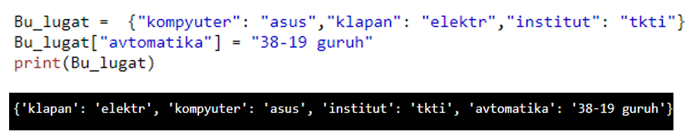 Boshqa to’plamlar singari lug’atda xam bazi funksiyalar bir xil vazifani bajaradi. Masalan, to’plam uzunligini topishda boshqalari kabi len metodidan foydalaniladi, va hokozo. Endi siz bilan to’plamga yangi kalit so’z bilan qiymat kiritish dasturini yozib ko’ramiz.