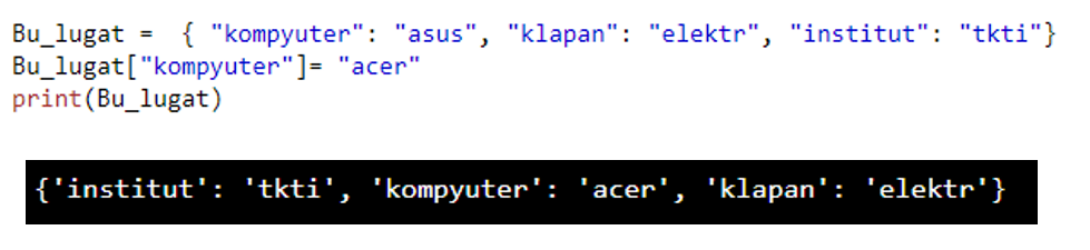 Lug’at ichidagi istalgan qiymatni boshqasiga o’zgartirishimiz mumkin. Buni quyidagicha amalga oshiramiz.