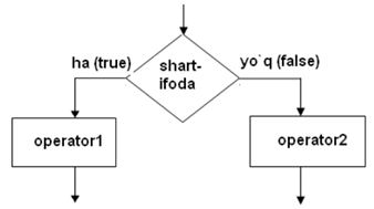 Bu yerda <shart-ifoda> 0 qiymatidan farqli yoki true bo‘lsa <operator1>, aks holda <operator2> bajariladi. If-else shart operator mazmuniga ko‘ra algoritmning tarmoqlanuvchi blokini ifodalaydi: <shart-ifoda> - shart bloki (romb) va <operator1> blokning «ha» tarmog‘iga, <operator2> esa blokning «yo‘q» tarmog‘iga mos keluvchi amallar bloklari deb qarash mumkin.