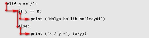 Oldin ham aytib o’tilganidek, Pythonda bloklar bilan ishlashda e’tiborli bo’lish kerak. Blok tarkibiga kiruvchi har bir operator shu blokning tagida qoldirilgan bo’sh joylardan keyin yoziladi. Bo’sh joylar Tab tugmasi bilan bosish orqali hosil qilinadi. Bloklardan chiqish uchun ajratilgan bo’sh joyni o’chirish kerak bo’ladi. Python dasturlash tilida bloklarning bu tarzda ortiqcha dastur kodlarisiz belgilanishi dasturchi uchun algoritmni yozishini osonlashtiradi.