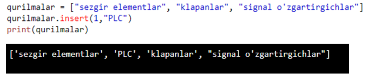 Yuqoridagi dasturda insert metodidan foydalanib“PLC” elementini 1-indexga kiritdik. Ro’yxat bo’limining boshqa metodlardan foydalanib o’zingiz xar-xil dasturlarni yozib ko’rishingiz mumkin.