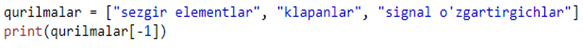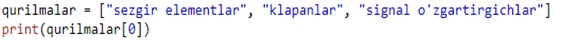 Yuqoridagi misolda ko’rganingizdek biz ro’yxat o’zgaruvchisidan foydalanib “qurilmalar” ga tegishli ma’lumotlar to’plamini chiqardik. Endi bu ma’lumotlar ichidan istalgan bitta elementni tanlab chiqarishni ko’ramiz. Python dasturida bu indexga murojaat qilish deyiladi. Masalan bizning misolda “sezgir elementlar” elementining indexi 0 ga, “klapanlar” elementiniki esa 1 ga teng, va hokozo.