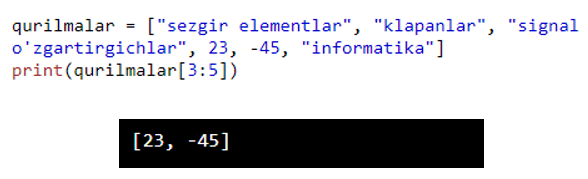Mana biz so’ragan natijani oldik. Bu qanday ishladi? Biz dasturga 3-elementdan boshlab 5- elementgacha(5-element kirmaydi) bo’lgan ma’lumotlarni chiqar degan buyruqni [3:5] orqali berdik va natijani oldik. E’tibor bergan bo’lsangiz bizda 3-indexda 23, 4-indexda -45, 5-indexda esa informatika so’zi joylashgan.