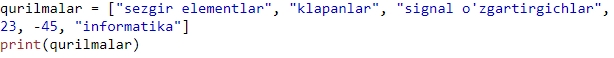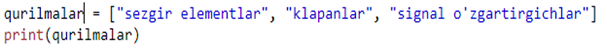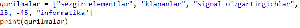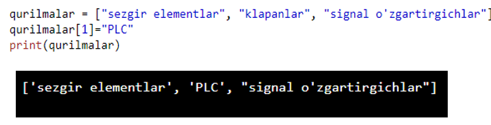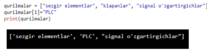 Biz yuqorida ro’yxat to’plamini o’zgaruvchan deb atadik. Xozir buni sinab ko’ramiz. Birinichi indexda turgan “klapanlar” elementini “PLC” elementiga quyidagicha o’zgartiramiz.