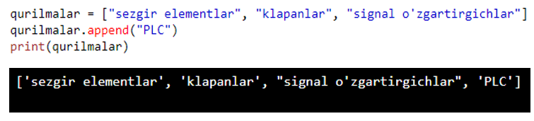 Quyidagi dasturimizda append metodidan foydalanib ro’yxatga yangi element qo’shishimiz mymkin. E’tibor bergan bo’lsangiz yangi element ro’yxatning oxiridan qo’shiladi.